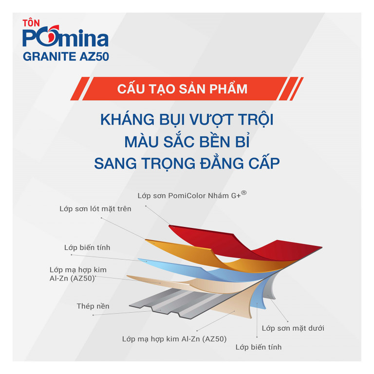 Để đảm bảo tính bền màu, dòng tôn này được chế tạo gồm 7 lớp sơn bảo vệ vững chắc cho cả 2 bề mặt trên và dưới. Đặc biệt, lớp sơn phủ PomiColor Nhám G+ được nghiên cứu, sáng tạo bởi Tôn Pomina và nhà cung cấp sơn hàng đầu thế giới AkzoNobel, đã tạo nên bề mặt tôn vân nhám độc đáo. Đây là một bản sắc riêng giúp người tiêu dùng Việt dễ dàng nhận diện và không bị nhầm lẫn Tôn Pomina Granite với các sản phẩm khác.